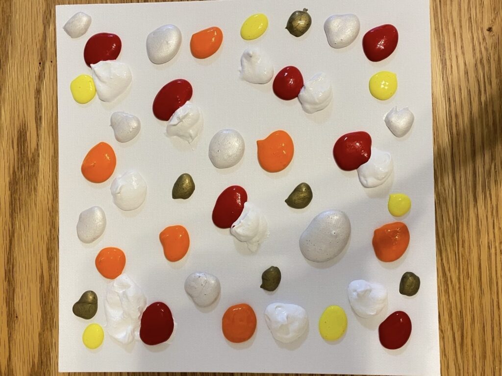 ②キャンバスに直接絵の具を数カ所に置きます。