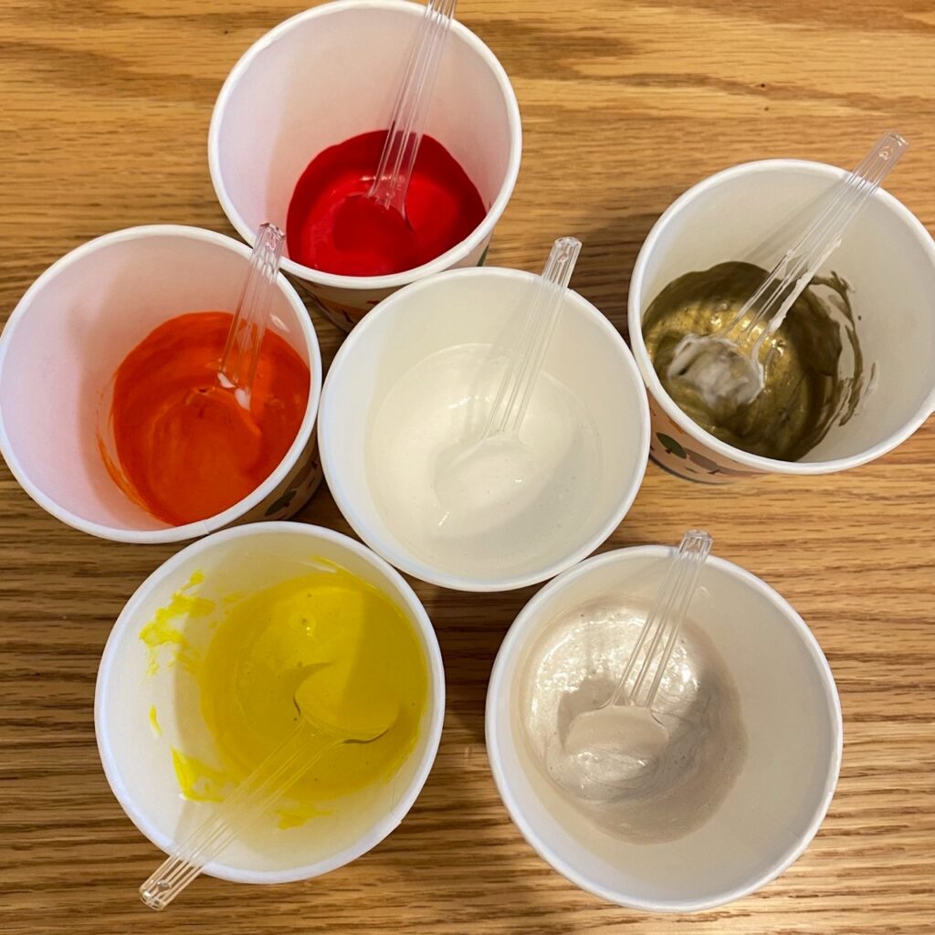 ①紙コップに絵の具:重曹:メディウム=2:1:2になるように出してスプーンで混ぜます。