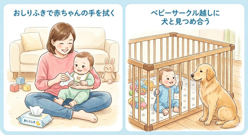 ベビーベッドやベビーサークルを使って、犬が自由にアクセスできない赤ちゃん専用の安全スペースを確保しています。特に目を離す瞬間(トイレや料理中など)は、必ずこのスペースに赤ちゃんを入れるようにしています。
